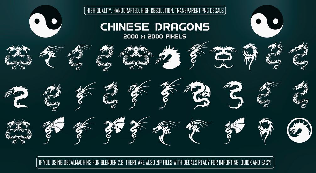 170+ handcrafted, transparend PNG decals. Kanji Symbols, Chinese Dragons and Russian Alphabet (clean and damaged versions)